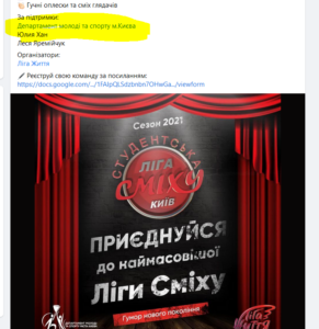 Цьогоріч організують і проведуть «Студентську лігу сміху 2021». Мова про постановку і режисерування, оренду обладнання, кава-брейки для учасників чотирьох етапів, художнє оформлення заходу, дизайн реклами, послуги ведучих заходу та відео-сюжетів, фото- та відео-послуги, трансляцію, майстер-класи, а також маски, антисептики та термометри.