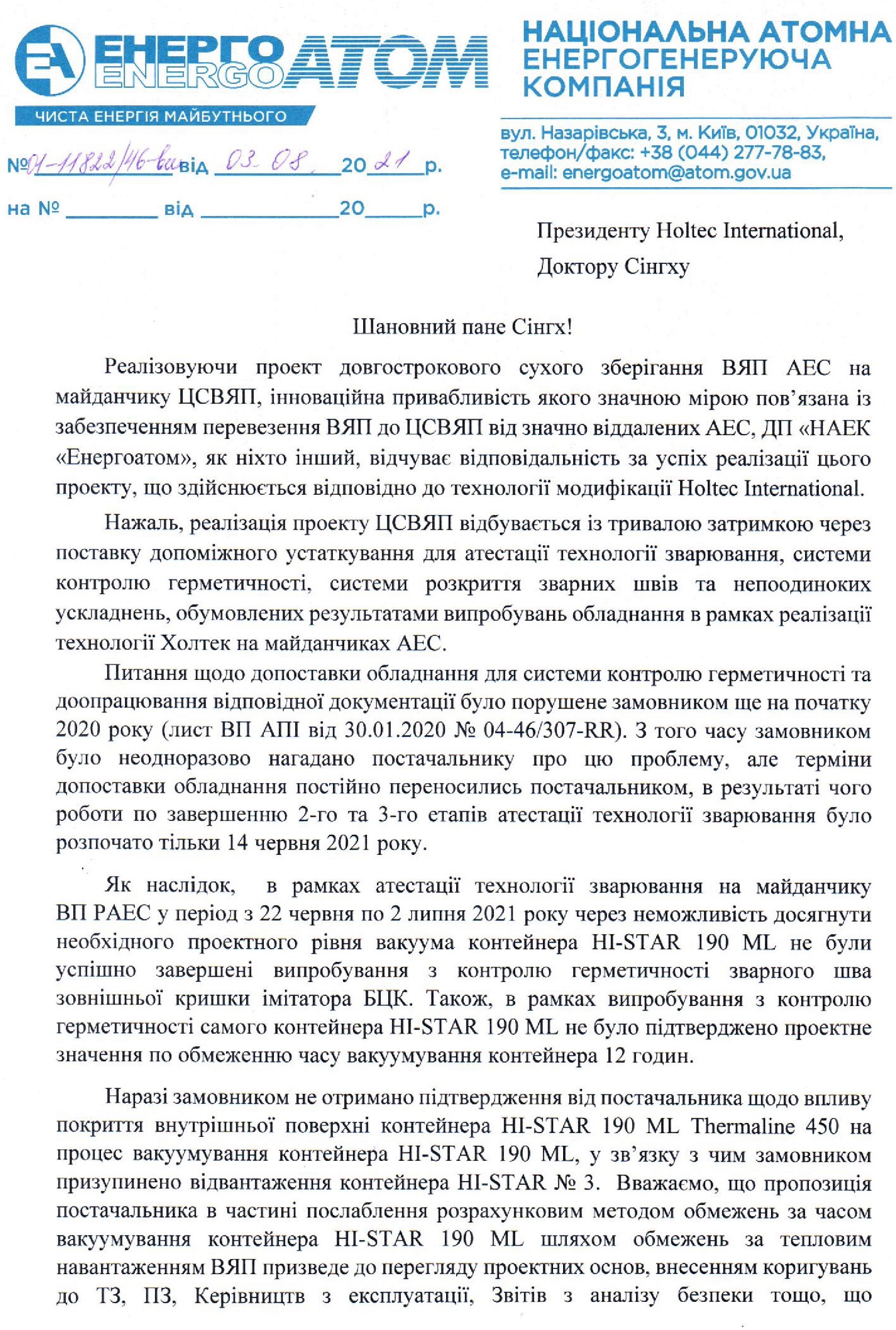 Державна компанія в листі до американської «Holtec International» від 3 серпня написала, що проект ЦСВЯП реалізується із тривалою затримкою через поставку допоміжного устаткування для атестації технології зварювання, системи контролю герметичності, системи розкриття зварних швів та непоодиноких ускладнень, обумовлених результатами випробувань обладнання в рамках реалізації технології Holtec на майданчиках АЕС.