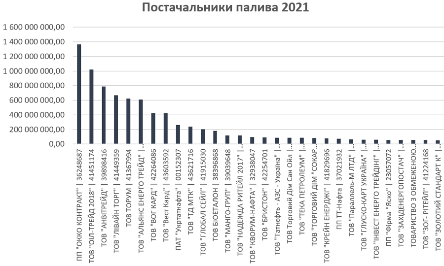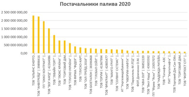 А третю лінію постачальників формували компанії з орбіти Коломойського («Лівайн Торг», «Оіл Трейд-2018»), Агеєва («Люкс Країна»), Грановського («Фідея», «Торум») та азербайджанська «Сокар Україна».