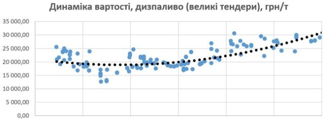 Торги на дизпаливо відбувалися здебільшого на значні суми. Але тренд до збільшення вартості палива є аналогічним.