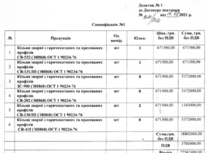 У договорі зварні кільця з гарячекатаних та пресованих профілів різного типу коштують 671,50 тис грн/шт (без ПДВ), або $25,05 тис/шт. «Прогрес» закупив кільця такого виду профілів: CВ-532; СВ-131 ЛП; ЗС-900; СВ-282; СВ-130 ЛП; СВ-415.