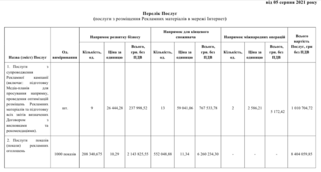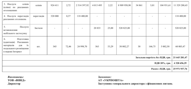 5 серпня АТ «Укрпошта» уклало угоду з ТОВ «Вівід» з розміщення рекламних матеріалів в Інтернеті за 25,97 млн гривень. Про це повідомляється в системі «Прозорро».