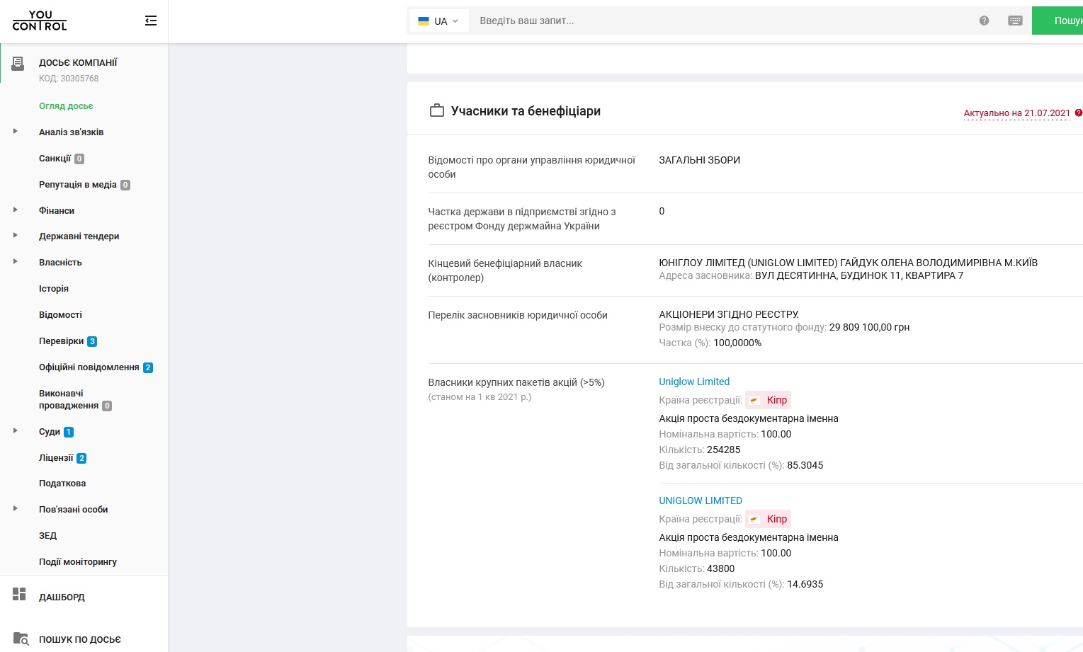 За даними Youcontrol, власником Uniglow Limited є Олена Гайдук, дружина Віталія Гайдука.
