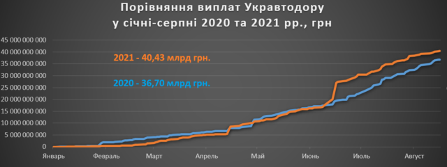 Сумарно за вісім місяців виплати Служб автодоріг склали вже 40,43 млрд грн. Це на 3,73 млрд грн більше за аналогічний період 2020 року. Але у порівнянні з липнем розрив скоротився. Бо у серпні виплати укравтодорівців підрядникам були на 2 млрд мільярди гривень менше від виплат у цьому ж місяці минулого року. Також серпневі видатки вдвічі менше від липневих 11,36 млрд грн.