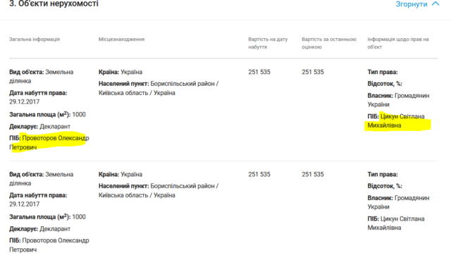 У 2018 році Світлана Цикун фігурувала у декларації Олександра Провоторова, як власниця земельної ділянки площею 1000 кв м у Бориспільському районі, у якому і буде зводитись логістичний центр «Укрпошти». Пізніше у його деклараціях вона не фігурувала.