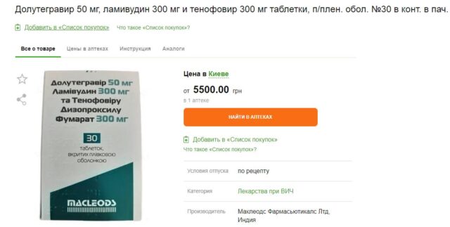 До грудня на умовах DAP (без розмитнення) поставлять 22,50 млн таблеток препарату тенофовіру дизопроксилу фумарат/ламівудин/долутегравір у дозуванні 300 мг/300 мг/50 мг по ціні 4,29 грн. за таблетку. Його виробником є компанія «Lupin Limited» (Індія).