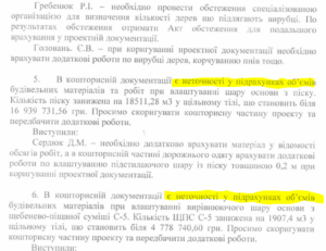 Однак згодом виявилось, що в кошторисній документації були допущені «неточності» на великі суми. Не врахували 19 тисяч кубометрів піску на суму 17 млн грн (тобто майже по 100 тисячі гривень за кубометр, що значно перевищує ринкові ціни). Також не врахували 1,9 тисяч кубометрів ЩПС С-5 на 4,8 млн грн.