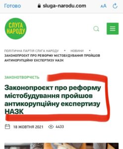 Після оприлюдення цих висновків партія «Слуга народу» опублікувала новину із заголовком: «Законопроект про реформу містобудування пройшов антикорупційну експертизу НАЗК». У новині коротко згадується про «недоліки, що несуть корупційні ризики», і вказується, що вони будуть виправлені при розгляді законопроекту до другого читання на профільному комітеті.