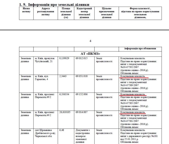 Для інших ділянок землі загальною площею понад 50 га в чотирьох областях, включаючи 35 га на Шулявці в Києві, умови приватизації не встановлюють жодних вимог у використанні новим власником АТ «ПКМЗ».