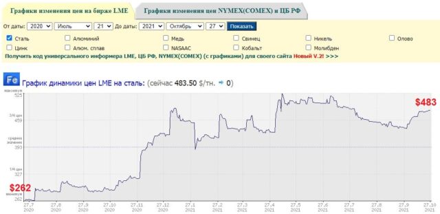 Відтоді ціна сталі на біржі LME зросла дещо менше – на 84%: із $262 до $483 за тонну.
