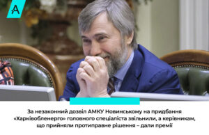 За незаконний дозвіл Вадиму Новинському на придбання «Харківобленерго» звільнили головного спеціаліста АМКУ. А керівникам, що прийняли протиправне рішення – дали премії. Про це повідомила «Ліга антитрасту».