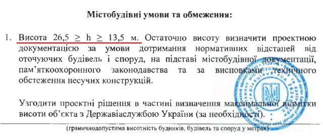 Між тим, у містобудівних умовах та обмеженнях висота будівлі була визначена на рівні 26,5 м (орієнтовно 9 поверхів).