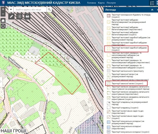 Відповідно до чинного Генплану Києва, вказані ділянки належать переважно до території житлового садибної забудови (не вище 4 поверхів), частково території захисної зелені.