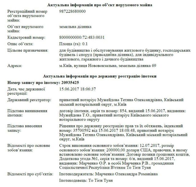 У 2016 році тодішній депутат Київради, перший заступник голови постійної комісії Київради з питань містобудування, архітектури та землекористування, старший партнер юридичної фірми «Ілляшев та Партнери» Роман Марченко задекларував повернення безпроцентної позики у розмірі 46,4 млн грн від То Тієн Туана. Більше того, у 2017 році То Тієн Туан позичив у дочки Марченка Олександри Марченко $200 тис, передавши в іпотеку по цьому зобов’язанню чотири ділянки на вул. Новозаводській, 69-75. А юристка фірми «Ілляшев та Партнери» Галина Лефор вже не один рік є представником То Тієн Туана в судах.