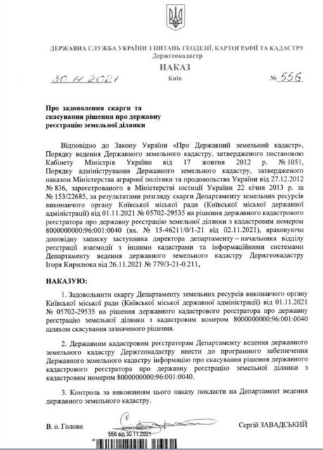 В.о. голови Держгеокадастру Сергій Завадський наказав державним кадастровим реєстраторам внести до програмного забезпечення держземкадастру інформацію про скасування рішення про державну реєстрацію цієї ділянки.
