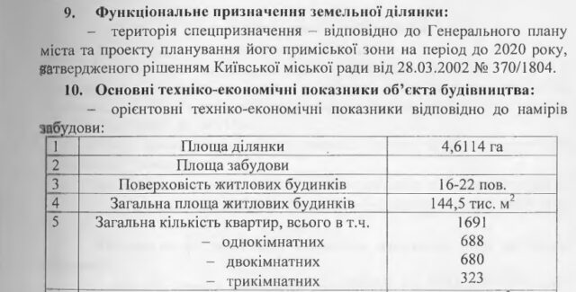 Служба безпеки отримала містобудівні умови та обмеження на будівництво житлових будинків на вказаній ділянці у грудні 2012 року. Згідно з техніко-економічними показниками, зазначеними в МУО, загальна площа будинків має становити 144,5 тис кв м, загальна кількість квартир – 1691, поверховість будинків – 16-22 поверхи.