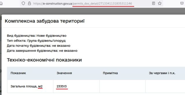 Відзначимо, що у заявці на отримання дозволу на будівництво СБУ вказало загальну площу забудови – 233,5 тис кв м.