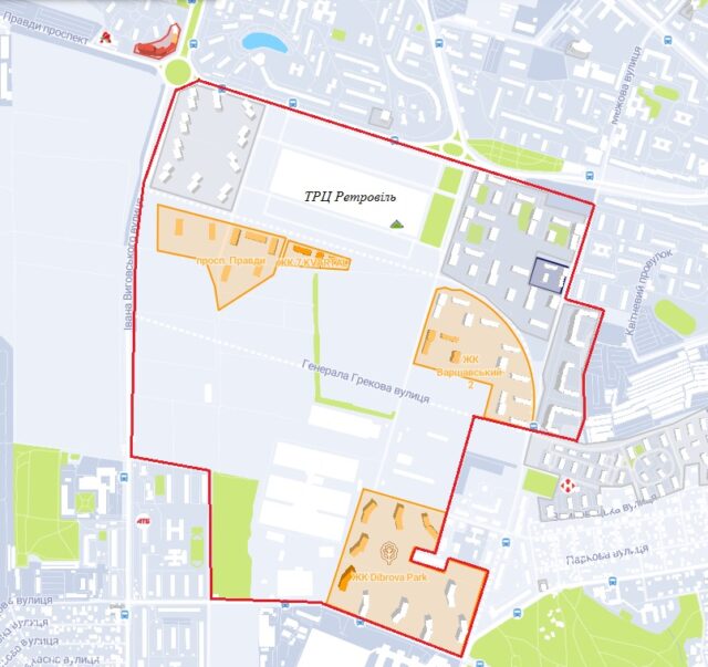 Ділянки площею 44 га, 7,9 га, 55 га, 25 га і 80 га в межах просп. Правди, вул. Івана Виговського, вул. Північно-Сирецької