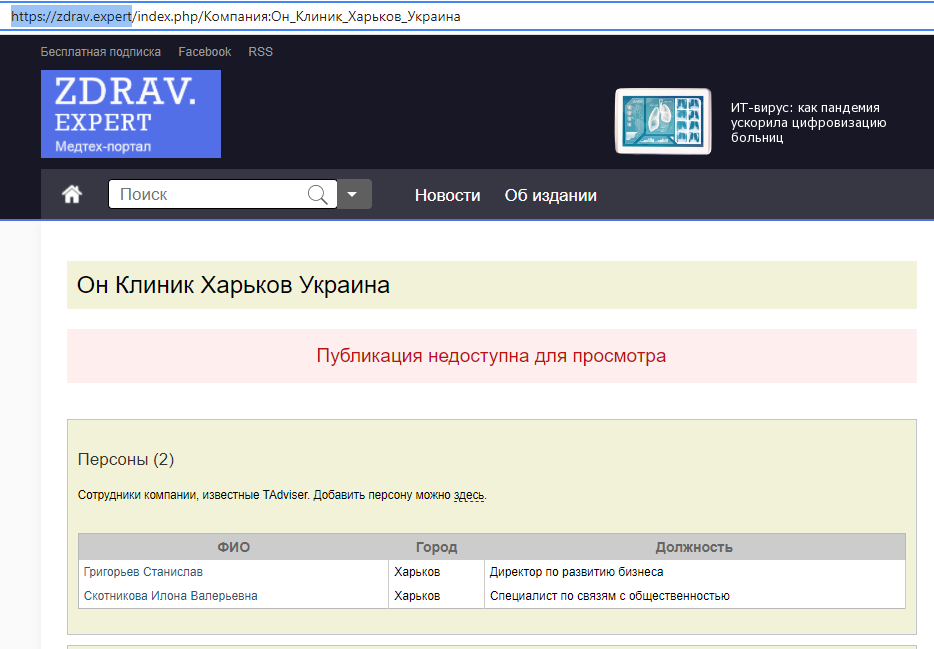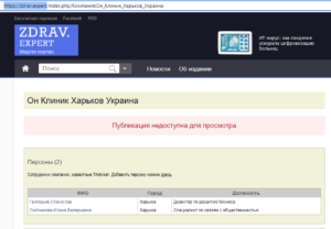 На ресурсі zdrav.expert Скотнікова та Григор’єв вказані як співробітники компанії «Он клінік Харків». Скотнікова працювала спеціалістом по зв’язкам з громадськістю, а Григор’єв – директором по розвитку бізнесу. Відношення Скотнікової до «Он Клінік» підтверджував і її чоловік у своїх деклараціях.
