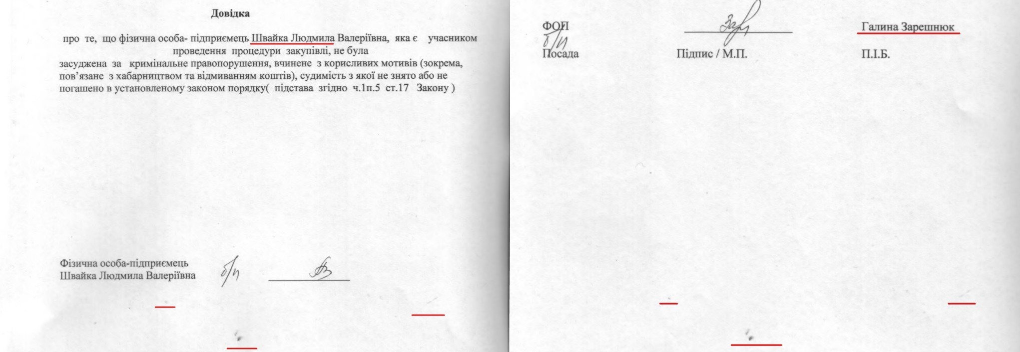 Єдиним конкурентом на цій закупівлі виступила Галина Зарешнюк, також приватна підприємиця з Бродів. Її пропозиція була лише на тисячу дорожчою. Під час аукціону учасниці не торгувались. А Галина Зарешнюк не мала шансів на перемогу, оскільки не надала жодного договору, який би підтверджував аналогічний досвід. Крім того, у документах підприємиць помітні однакові дефекти друку чи сканування, що може свідчити про виготовлення їх на тій самій техніці. Однакове програмне забезпечення також зазначено у метаданих їхніх довідок.