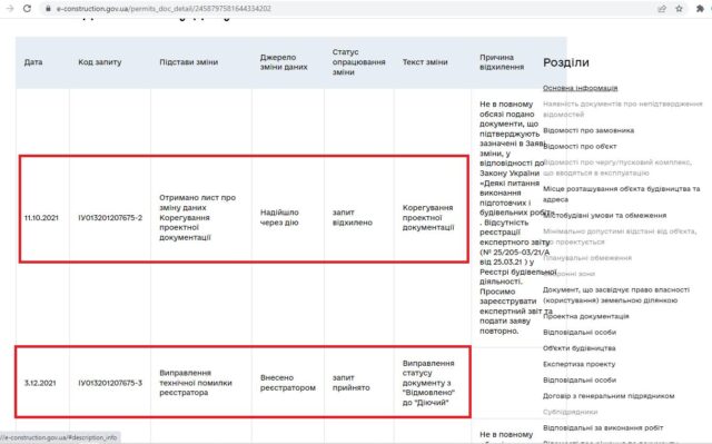 Надалі забудовник намагався внести зміни у цей дозвіл, і перетворити адміністративно-офісну будівлю на житловий комплекс. У квітні 2021 року ще не реформоване ДАБІ йому відмовило. У жовтні – відмову у реєстрації змін в проект надала вже новостворена ДІАМ.