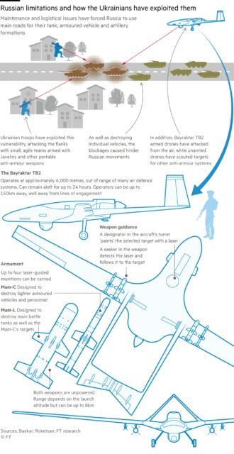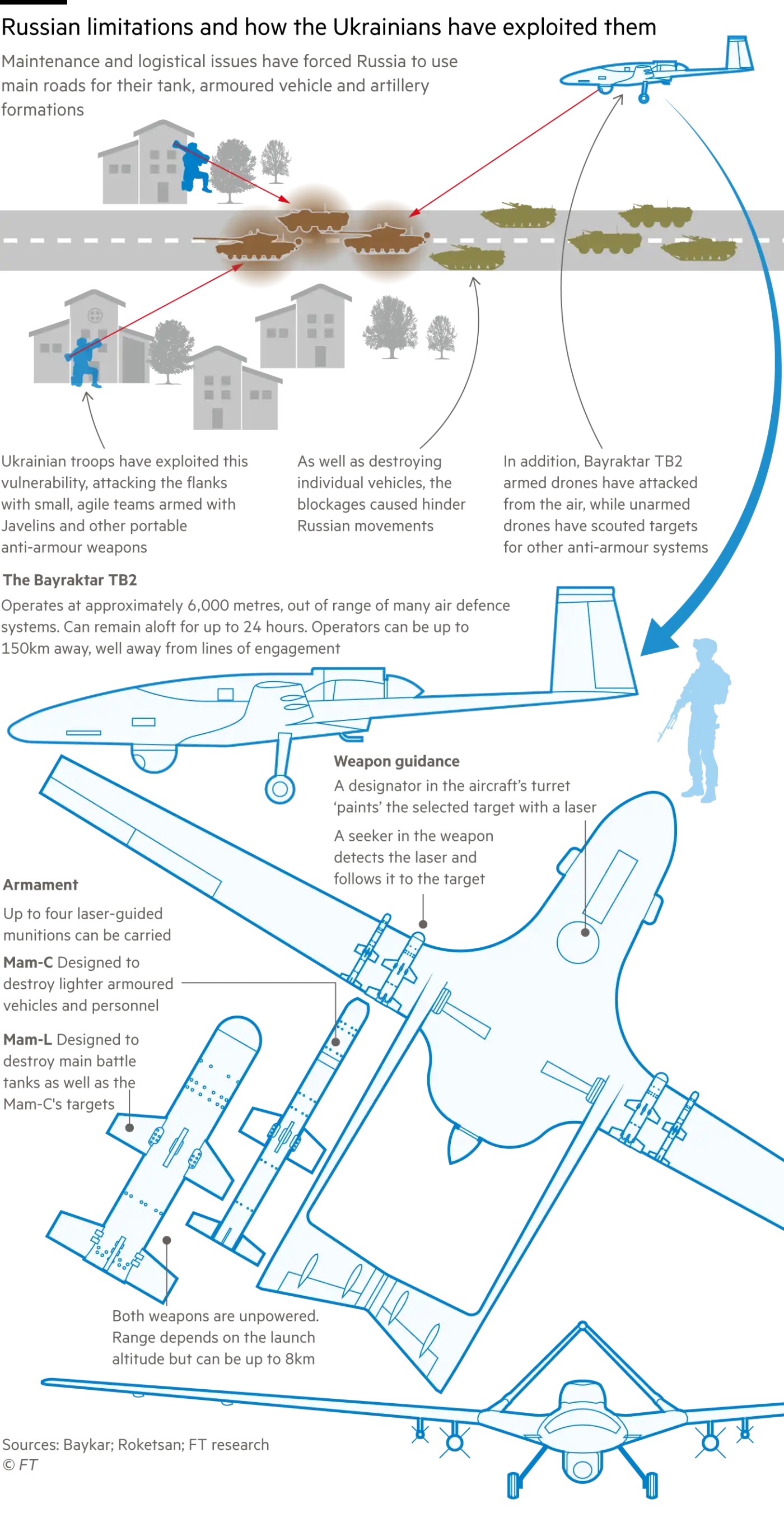 А по-друге, війська, що обороняються, зрозуміли, що можуть відносно вільно діяти в лісах, полях і селах по узбіччях дороги. З невеликим прикриттям російської піхоти на флангах російська техніка виявилася вразливою для засідок невеликих груп українських військ, вибиваючи цілі з укриття, які потім могли приховати їхній відступ.