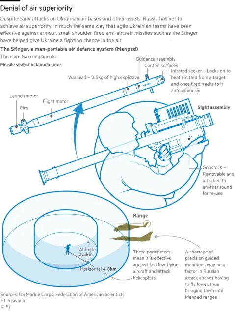 Крім того, використання українськими військами керованих з плеча ракет класу «земля-повітря» для успішного нападу на російські вертольоти і винищувачі, що низько летять, посилило стриманість Москви щодо розгортання занадто великої кількості авіації.
