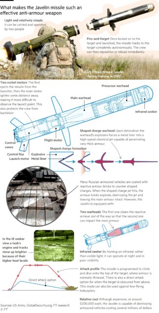 Вони були відправлені в Україну до того, як почалося вторгнення, щоб західні військові інструктори навчили війська найкраще використовувати їх, і тепер вони тисячами прибувають із країн усього альянсу НАТО. Українські та західні офіційні особи заявили, що це постачання є найважливішою опорою опору вторгненню. Його компактний розмір робить його легко транспортується для швидкої піхоти, а система стеження за ракетою означає, що її можна вистрілити і забути, що дозволяє військам швидко залишити місце атаки ще до того, як снаряд вразить ціль. Подвійна бойова частина також дозволяє їй завдавати серйозних пошкоджень посиленим російським танкам.