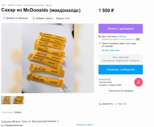 Журналісти також з’ясували, що на сайті оголошень мешканці Тули виставили порційні пакетики з цукровим піском із McDonald’s – по 1,5 тис рублів (приблизно 500 грн.) за штуку. Представили їх як універсальний продукт: можна в колекцію, можна в чай.