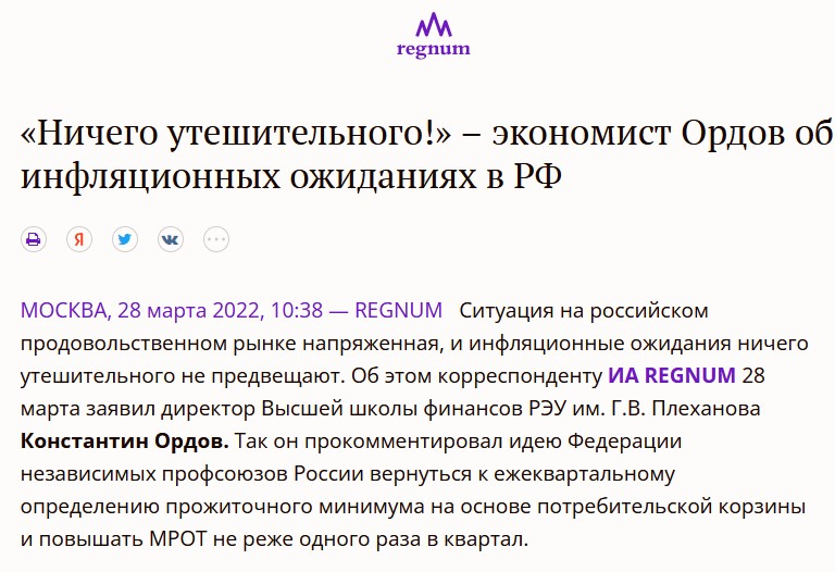 «Люди, які розраховують на прожитковий мінімум, справді найгострішим чином потребують підтримки та турботи держави. Індексація раз на квартал, природно, краща за щорічну індексацію, особливо в період високої інфляції. Але, може, все-таки варто вбудувати систему адресної допомоги, причому допомоги продуктами харчування, що точно дозволить покласти продовольство в споживчий кошик, а не вимагатиме полювання на знижки та необхідність купувати низькоякісні товари», – заявив Ордов.