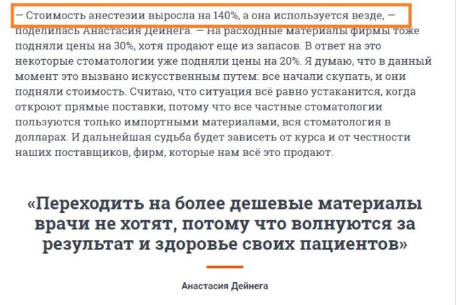«Вартість анестезії виросла на 140%, а вона використовується скрізь, – сказала Дейнега. – На витратні матеріали фірми також підняли ціни на 30%, хоча продають ще з запасів. У відповідь на це деякі стоматології вже підняли ціни на 20%».