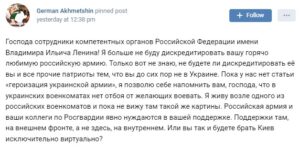 Пізніше у «ВКонтакте» він виклав іронічне каяття: «Я більше не дискредитуватиму вашу гаряче улюблену російську армію. Тільки ось не знаю, чи дискредитуватимете її ви і всі інші патріоти тим, що ви досі не в Україні. Поки ми не маємо статті «героїзація української армії», я дозволю собі нагадати вам, панове, що в українських військкоматах немає відбою від бажаючих воювати. Я живу біля одного з російських військкоматів і поки що не бачу там такої ж картини».