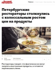 Ресторатори Петербурга скаржаться на колосальний ріст цін на імпортні продукти через обвал рубля та порушення логістичних ланцюжків. Про це пише «Діловий Петербург».