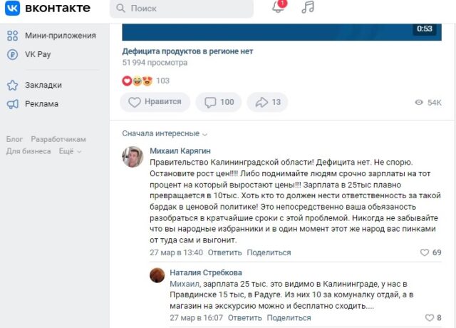 «Уряд Калінінградської області! Дефіциту нема. Не сперечаюсь. Зупиніть зростання цін! Або піднімайте людям терміново зарплати на той відсоток, на який зростають ціни! Зарплата в 25 тис. плавно перетворюється на 10 тис. Хоч хтось має відповідати за такий бардак у ціновій політиці Це безпосередньо ваш обов’язок розібратися в найкоротший термін із цією проблемою. Ніколи не забувайте, що ви народні обранці і в один момент цей народ вас стусанами звідти сам і вижене!».