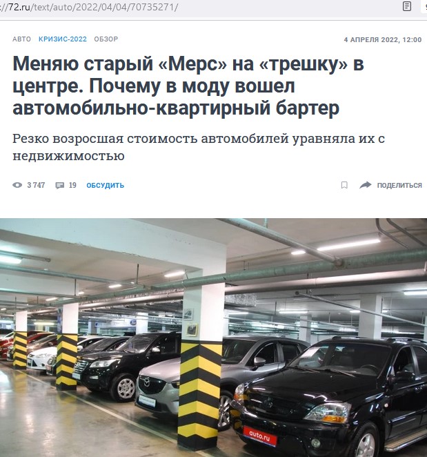 Журналісти «72.ru» вивчили ситуацію на вторинному ринку Тюмені (нафтодобувний край на півночі РФ) та виявили, що ряд старих машин сьогодні коштує дорожче, ніж у момент первинної покупки. Їх вже обмінюють на квартири, як і у Єкатиренбургу.