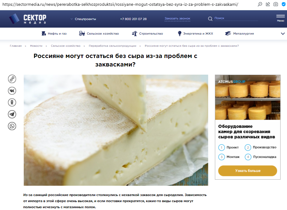 Знадобиться не один рік, щоб розвинути цей напрямок у Росії. Що робитимуть сировари зараз, якщо постачання заквасок із ЄС припиниться? За оцінками фахівців, запасів у країні вистачить десь три місяці. Постачальники шукатимуть способи доставляти свій товар до Росії в обхід обмежень, але нестабільність ситуації негативно позначиться на ринку. Тому багато російських компаній замисляться про те, щоб «реанімувати» або створити власне виробництво заквасок. Однак сучасне заквасочне обладнання в РФ майже не випускають.