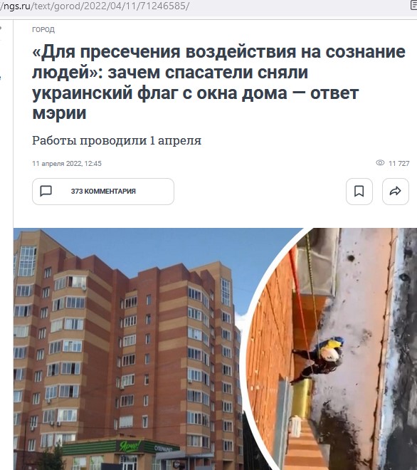 Український прапор зняли з вікна багатоповерхового житлового будинку по вулиці Роз’їзна у Новосибірську 1 квітня – його вивісила 60-річна місцева мешканка у власній квартирі. Мерія так пояснила свої дії: