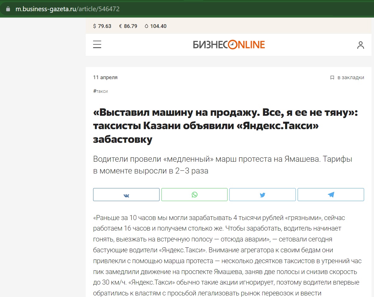 У зв’язку із цим у Казані, столиці Республіки Татарстан, 11 квітня відбулась протестна акція таксистів, які проїхали центральними вулицями міста на аварійці, скинувши швидкість до 30 км/год, – пише сайт «Бизнес.Online».