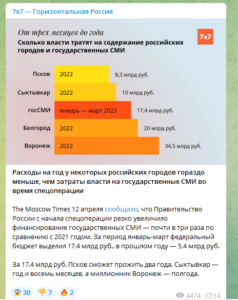 За січень-березень 2022 року Росія витратила на пропаганду в державних засобах масової інформації 17,4 млрд рублів, що втричі більше, ніж за аналогічний період 2021 року. На ці кошти Псков міг би жити два роки, Сиктивкар – майже два роки, а Воронеж – пів року.