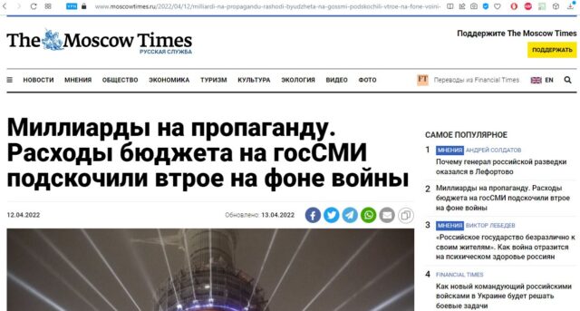 Як пише «The Moscow Times», уряд Росії різко збільшив фінансування державних ЗМІ на тлі війни з Україною, після початку якої градус державної пропаганди досягнув рівнів, небачених із часів сталінського СРСР.