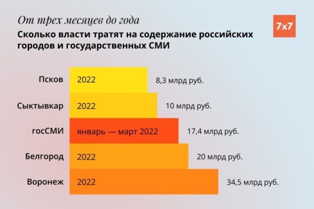 За 17,4 млрд рублів місто Псков може прожити два роки, Сиктивкар – рік і вісім місяців, а мільйонник Воронеж – півроку. Це підрахувало федеральне видання «7х7 – Горизонтальна Росія», яке було заблоковане Роскомнаглядом у березні, після вторгнення Росії в Україну.