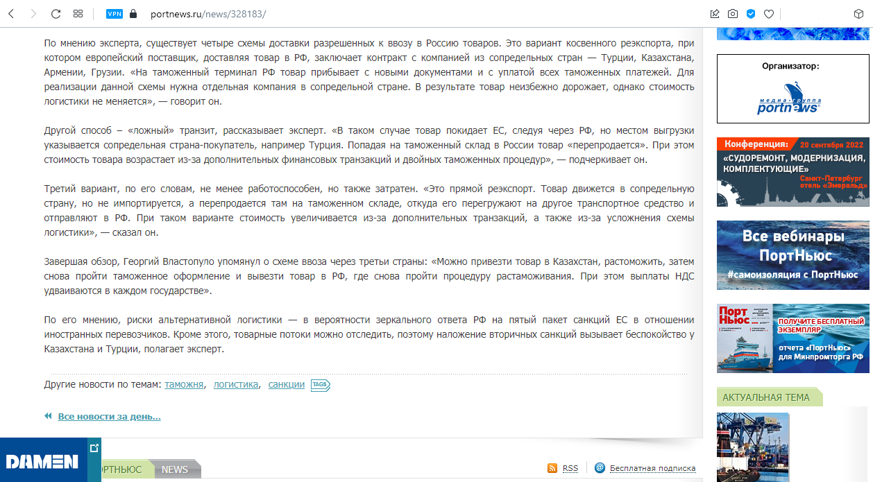 Росія в умовах санкцій за вторгнення в Україну використовує декілька шляхів вивезення товарів з Євросоюзу, які засновані на використанні можливостей суміжних країн. Про це розповів генеральний директор компанії «Оптимальна логістика» Георгій Властопуло на конференції «TransRussia» у Москві. Тези виступу опублікувало видання «ПортНьюс».