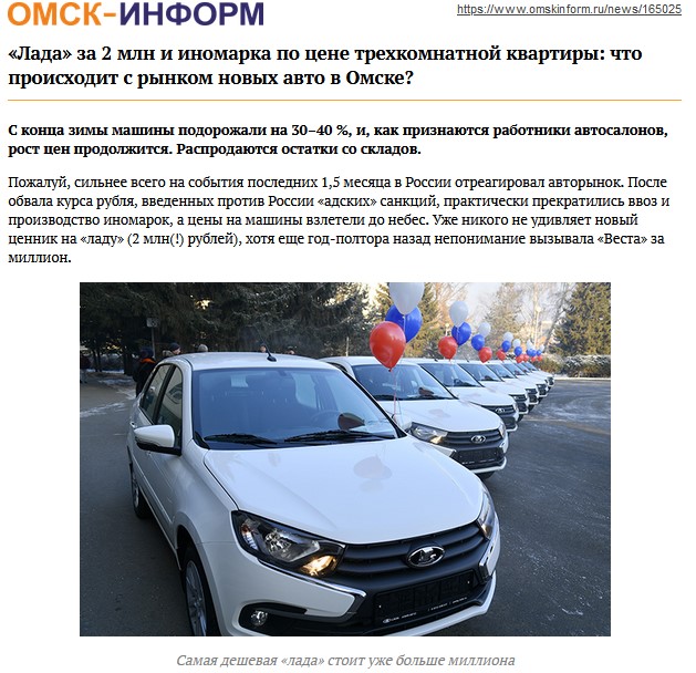 Між тим, автомобілі російського виробництва дуже швидко і непомітно наздогнали вартість своїх закордонних «побратимів». Зокрема, в омському автоцентрі, що спеціалізується на продажі продукції Волзького автозаводу, пропонують купити «Ладу-Весту» за 2-2,5 млн рублів.