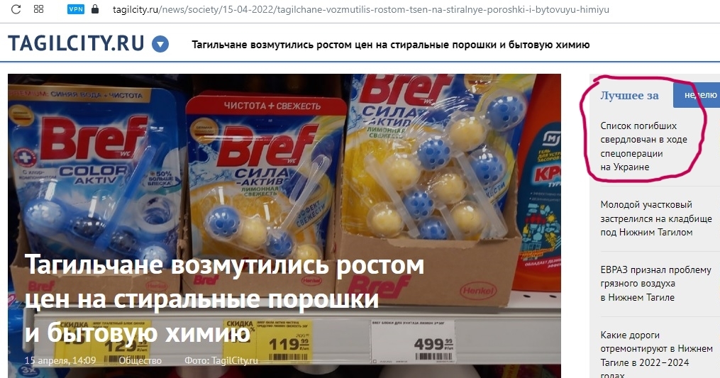 В Нижньому Тагілі (Свердловська обл. ОФ) ціни на імпортні засоби для прання та побутову хімію після «спецоперації» в Україні виросли в декілька разів. Російські аналоги подорожчали на 40%.