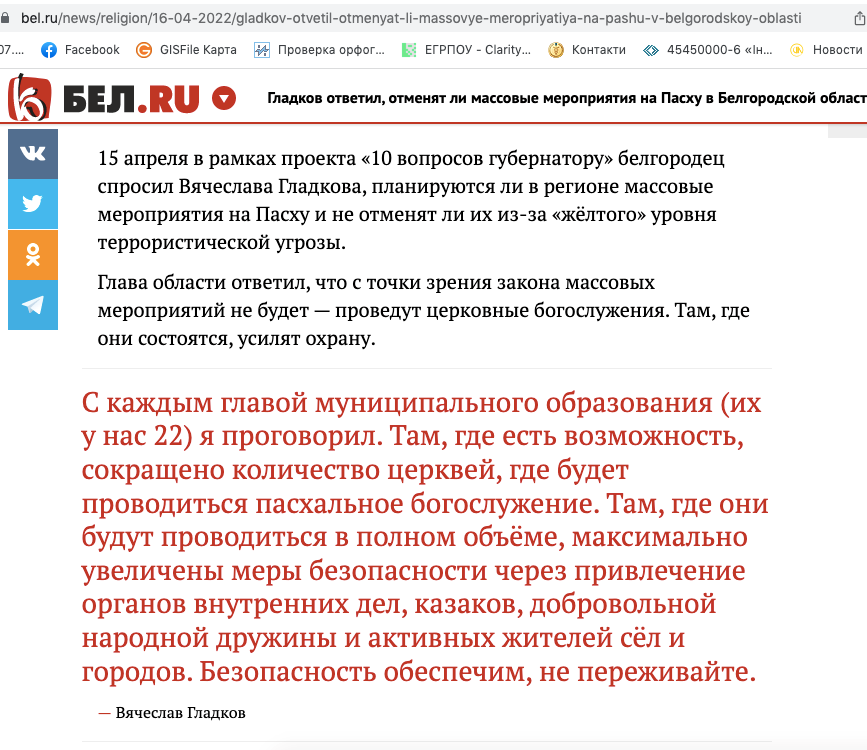 «З погляду закону, масові заходи не проводяться, є богослужіння у храмах. Сьогодні з кожним головою муніципального утворення, їх у нас 22, я проговорив. Там, де є можливість, скорочено кількість церков, де проводитиметься пасхальне богослужіння. Там, де вони будуть проводитися у повному обсязі, максимально збільшено заходи безпеки через залучення органів внутрішніх справ, казаків, добровільної народної дружини та активних мешканців сіл і міст. », – сказав Гладков.