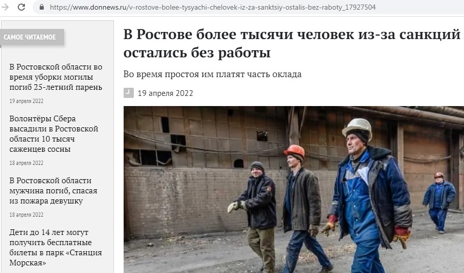 У Ростові-на-Дону (РФ) станом на середину квітня 1217 людей не працюють через те, що їхні підприємства змушені були зупинити діяльність через санкції, введені щодо Росії після початку війни.