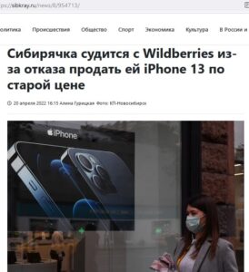Мешканка Новосибірська подає позов до суду на популярний інтернет-магазин Wildberries. Жінка звинувачує компанію у відмові продати їй iPhone 13 за старою ціною. Сибірячка розповідає, що замовила смартфон ще 22 лютого – з того часу гаджет їй не доставили, заявивши, що він загубився на складі, передає sibkray.ru.