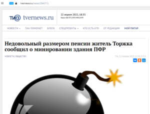 Невдоволений розміром пенсії чоловік «замінував» будівлю пенсійного фонду в місті Торжок Тверської області РФ. Його засудили до трьох років позбавлення волі умовно з випробувальним терміном один рік. Про це написало місцеве видання «TverNews.Ru».