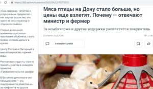 За даними глави «Росптицесоюзу» Галини Бобильової, за останні три місяці собівартість виробництва птиці зросла на 16%. Це позначиться на роздрібній ціні, сказав кореспондентові «161.ru» міністр сільського господарства Ростовської області Костянтин Рачаловський.