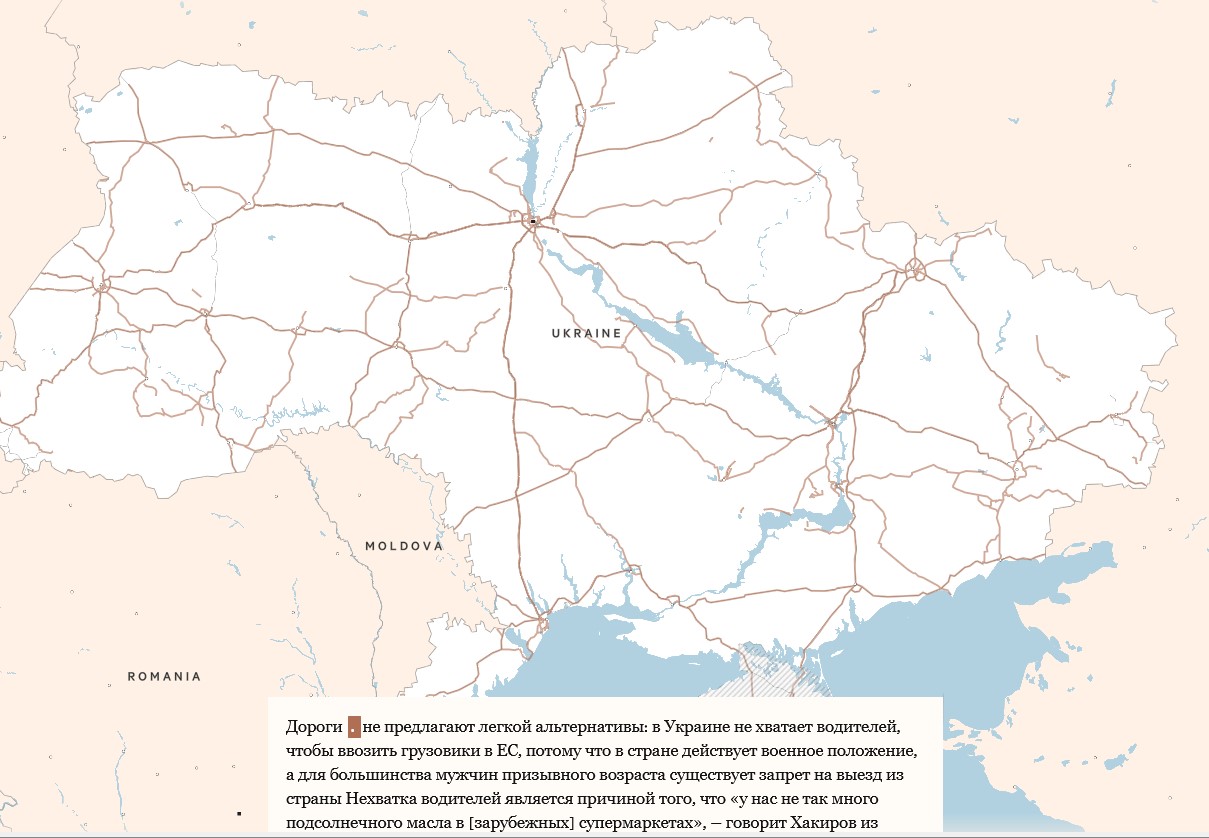 Дороги не є легкою альтернативою. В Україні не вистачає водіїв, щоб везти вантажівки в ЄС, оскільки в країні діє воєнний стан, а більшість чоловіків призовного віку забороняють виїжджати з країни. Через брак водіїв «у нас не так багато соняшникової олії в [закордонних] супермаркетах», – каже Хакіров з «Дельти».